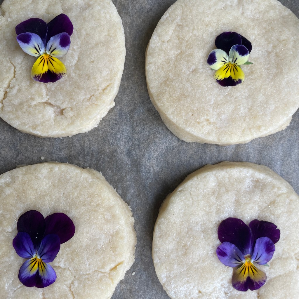 My go-to method for using edible flowers is to scatter them on a salad, but if you’d like to go beyond this classic use, there are numerous more unusual possibilities. Violas, for example, look lovely when wrapped up with shrimp and vegetables in a Vietnamese summer roll, or when pressed in paper under a heavy book for just an hour and then placed on baked cookies. (First, with a pastry brush, put egg white diluted with 1 tsp. water on top of the cookies, then put on the flowers and brush again over top of them to keep them in place, then sprinkle with a bit of sugar and bake the cookies for three more minutes.)
